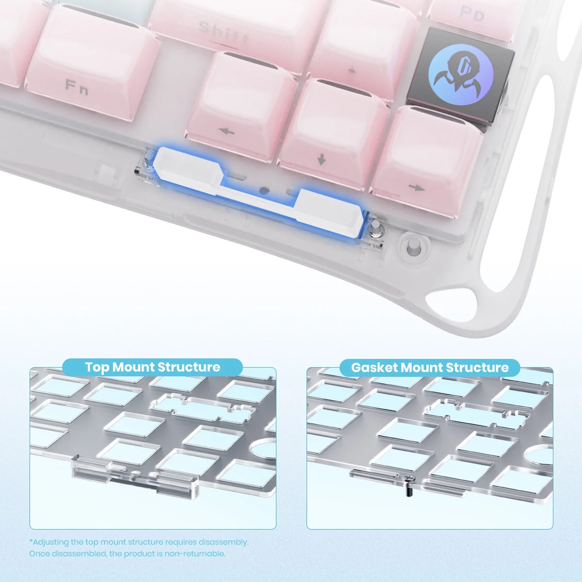 Sản phẩm có thiết kế tấm định vị khe ngang, mang đến cho người dùng sự linh hoạt tối đa trong việc tùy chỉnh. Tương thích với cả cấu hình gắn gioăng và gắn trên cùng, cho phép cá nhân hóa cảm giác gõ phím và tinh chỉnh hiệu năng.