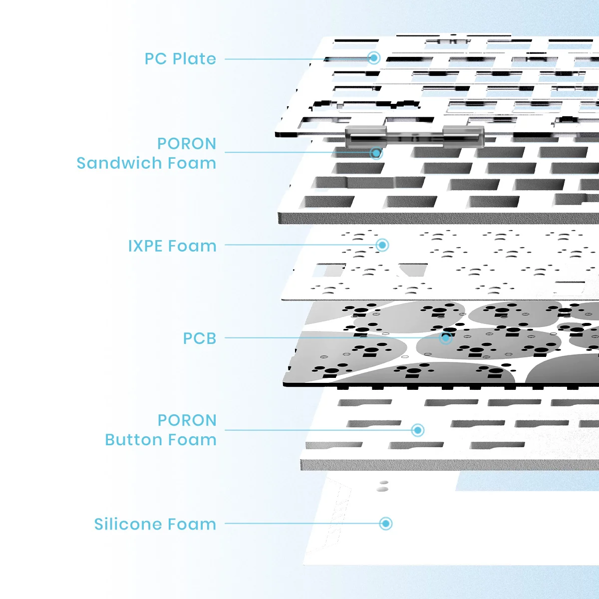 Sản phẩm tích hợp lớp đệm mút PORON giúp loại bỏ âm thanh rỗng và giảm rung. Công nghệ giảm âm tiên tiến tạo ra âm thanh "thock" đặc trưng mà những người đam mê âm thanh yêu thích, đồng thời vẫn đảm bảo độ yên tĩnh và phù hợp với môi trường văn phòng.