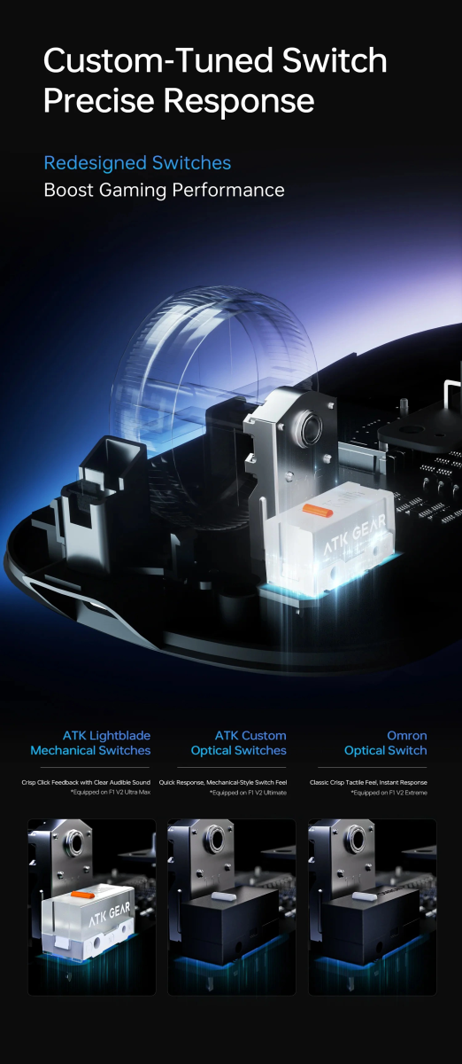 | Loại switch | ATK Lightblade Mechanical Switch | ATK Custom Optical Switch | Omron Optical Switch |