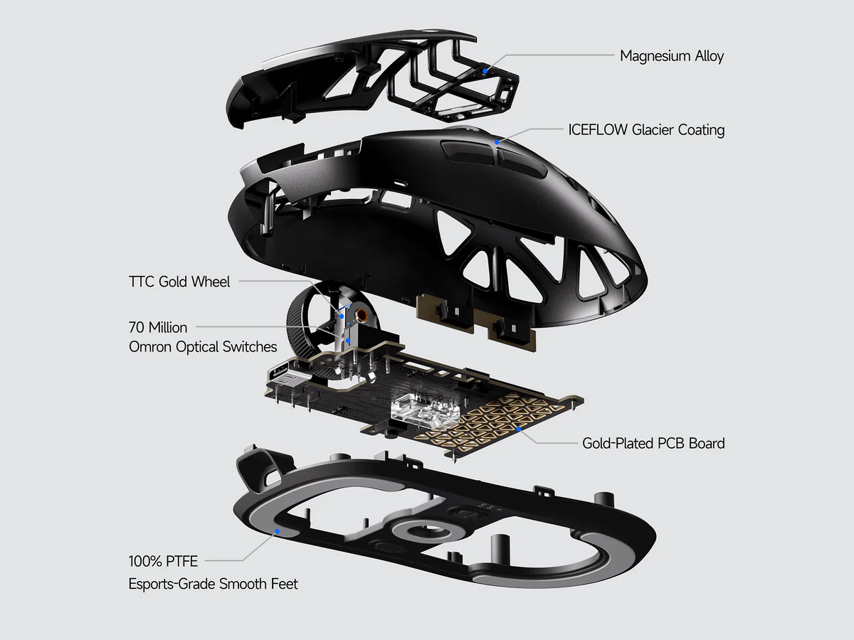 Vỏ máy cao cấp chắc chắn, tấm đáy khắc laser tùy chỉnh, đế trượt bằng kính, túi đựng chuột và bộ tăng tốc 8K đi kèm — không chỉ là một con chuột, mà là một công cụ thể thao điện tử đẳng cấp dành cho người sưu tầm.