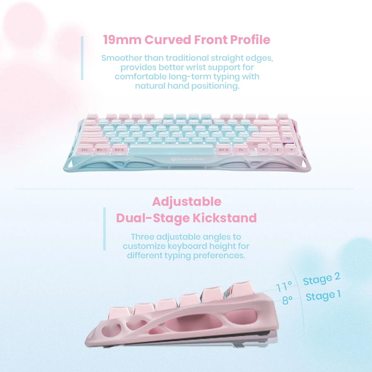 Được thiết kế chú trọng đến công thái học, bàn phím này có thiết kế cong phía trước 19mm, mang lại sự hỗ trợ cổ tay vượt trội và vị trí đặt tay tự nhiên, giúp gõ phím thoải mái trong thời gian dài. Chân đế điều chỉnh hai nấc với ba góc độ khác nhau cho phép bạn tùy chỉnh chiều cao bàn phím phù hợp với sở thích gõ phím cá nhân.