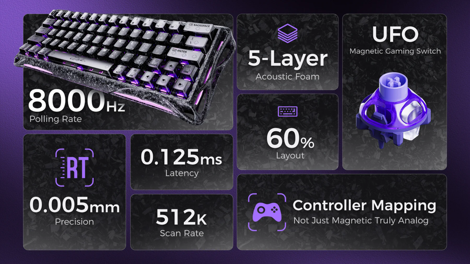 Công tắc Từ tính Gravastar UFO (Magnetic Gaming Switch): Được thiết kế với độ chính xác 0.005mm và độ sâu kích hoạt có thể điều chỉnh (0.005mm – $3.5mm), loại bỏ độ trễ và tăng cường kiểm soát.