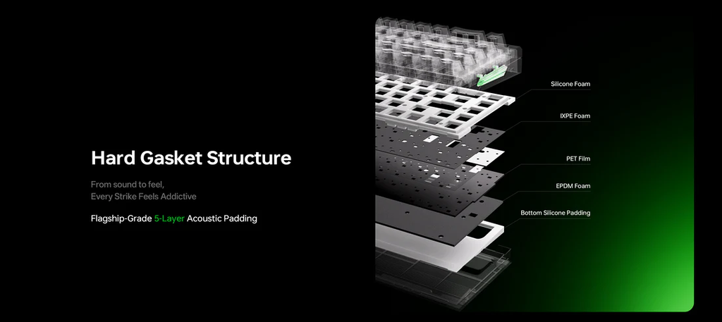 | Vật liệu tiêu âm trong | Silicone Foam / IXPE Foam / PET Film / Foam IXPE / Silicone đáy |