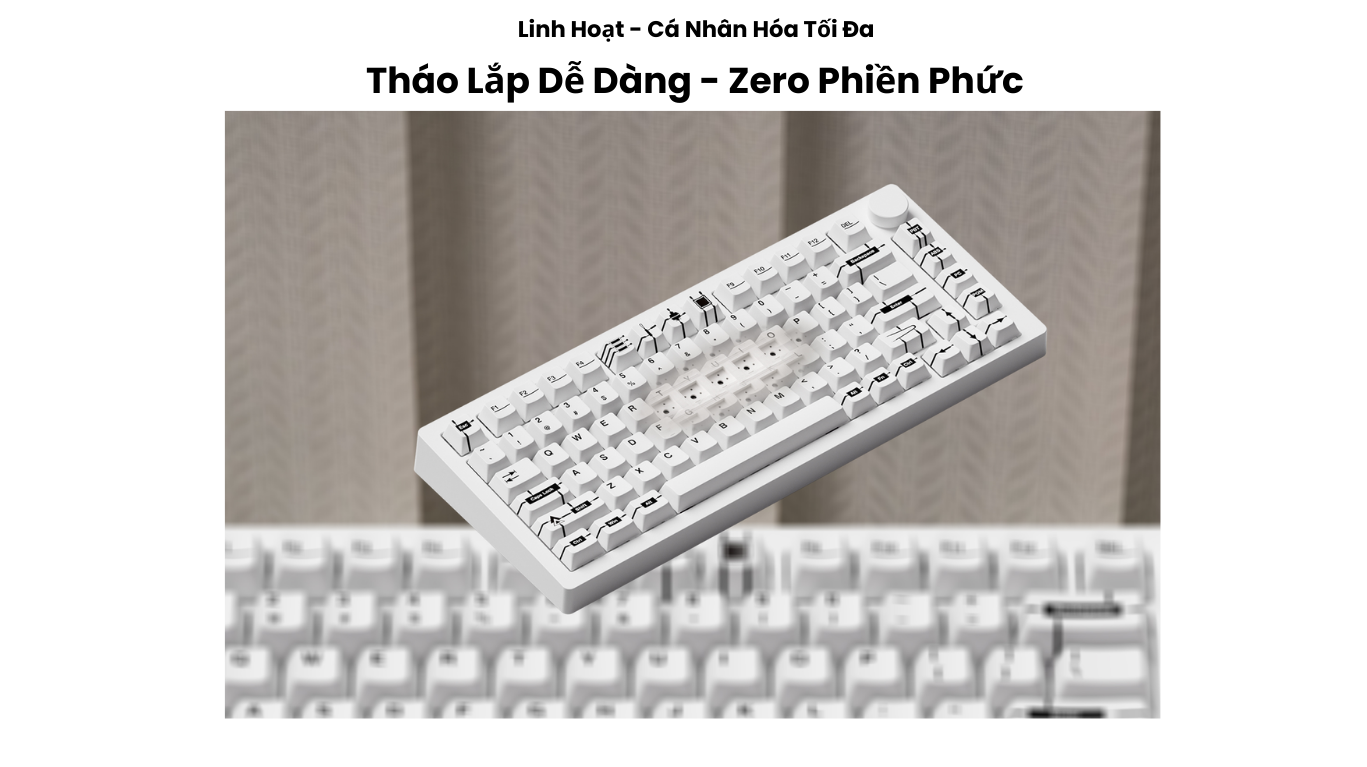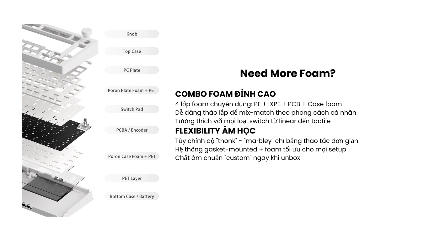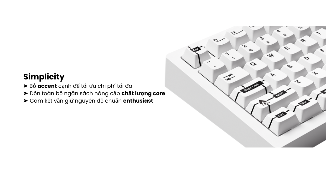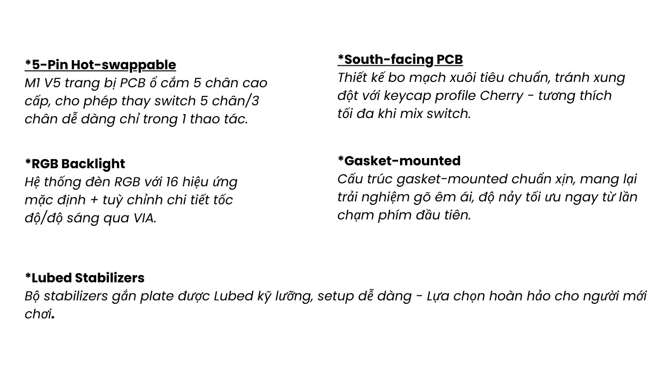 - Stabilizer (Dây ổn định phím):Lắp sẵn stabilizer dạng plate-mounted, chất liệu TPU double-shot