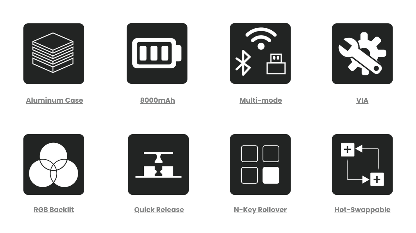 - Phụ kiện đi kèm:Bàn phím ×1,Hướng dẫn sử dụng ×1,Cáp Type-C ×1,keycap Puller ×1,switch Puller ×1,Bộ thu 2.4GHz ×1,Switch Extra,Đậy bàn phím.