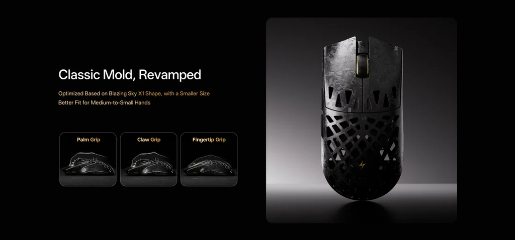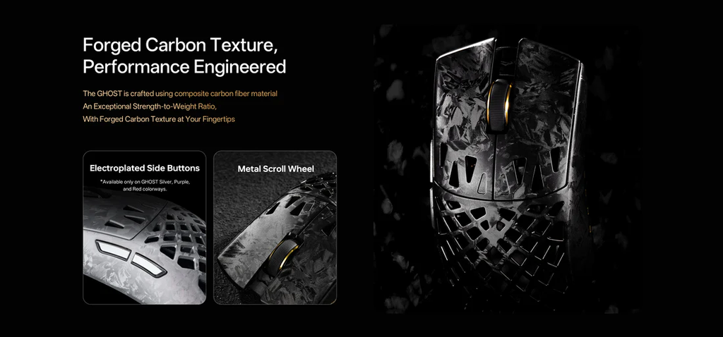 Sản phẩm sử dụng cấu trúc vỏ composite sợi carbon (Forged Carbon Texture) mang lại tỷ lệ sức mạnh trên trọng lượng vượt trội. Thiết kế "Hollowed-Out" (đục lỗ) ở cả mặt trên và mặt dưới không chỉ tạo vẻ ngoài độc đáo mà còn giúp chuột đạt trọng lượng siêu nhẹ chỉ 48g. Bên trong là hệ thống khung xương trung tâm (Central Skeleton) giúp gia cố lực và phân bổ trọng lượng cân bằng.