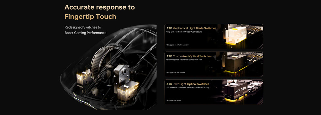 ATK Dragonfly A9 Air sử dụng switch cao cấp cho cảm giác click nhanh, rõ và độ bền cao, phù hợp cho cường độ sử dụng liên tục trong môi trường gaming. Con lăn và các nút bấm được tinh chỉnh để đảm bảo độ chính xác và độ ổn định lâu dài.