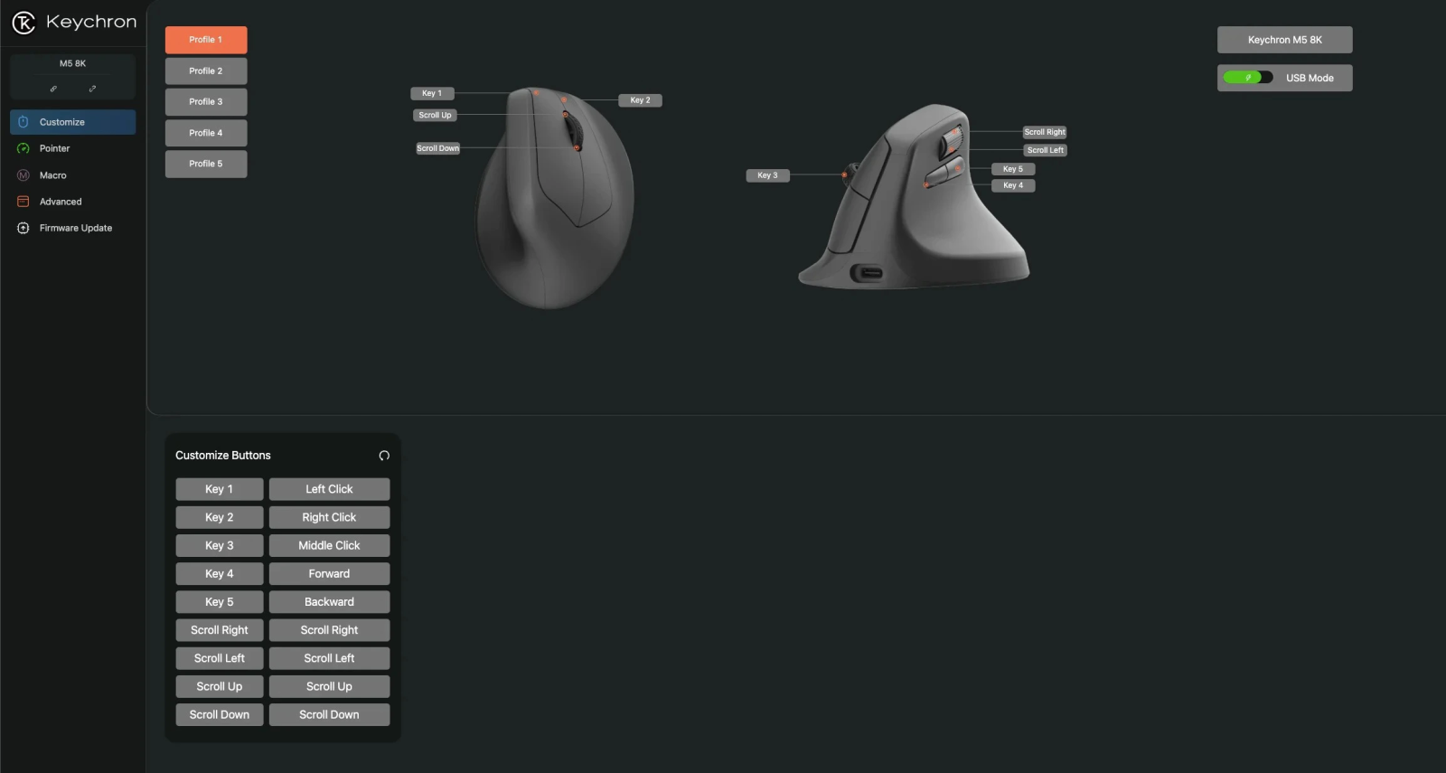 7 nút bấm với switch độ bền 20 triệu lần click, bao gồm nút DPI nhanh và nút bên hông có thể lập trình. Hỗ trợ phần mềm Keychron cho tùy chỉnh nút bấm, macro và profile, mang lại sự linh hoạt cho công việc và giải trí.