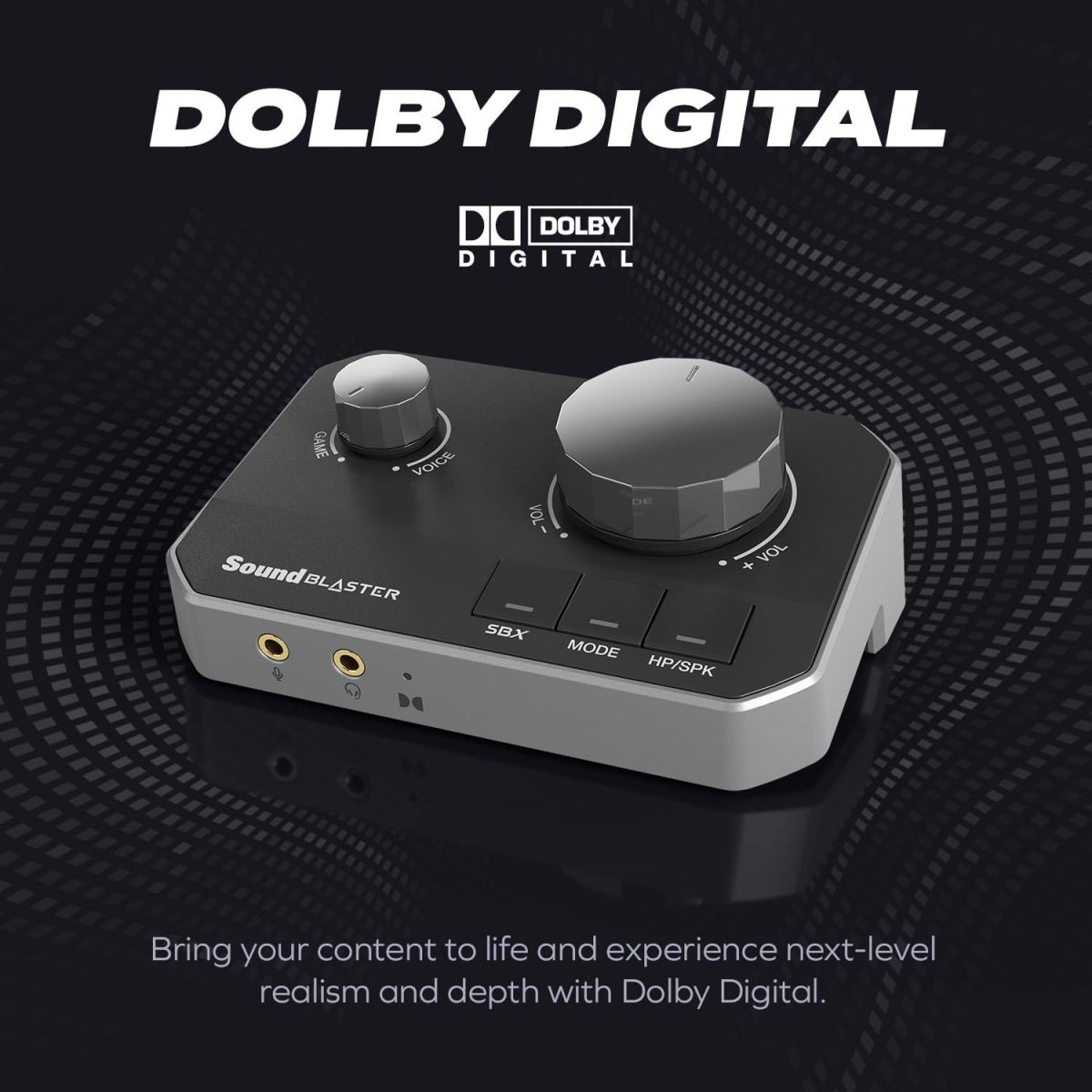 | Controls | Master volume dial, GameVoice Mix dial, Headphone gain switch, SBX button, Mode Button, HP / SPK Button, Opt-In / HDMI ARC mode switch |