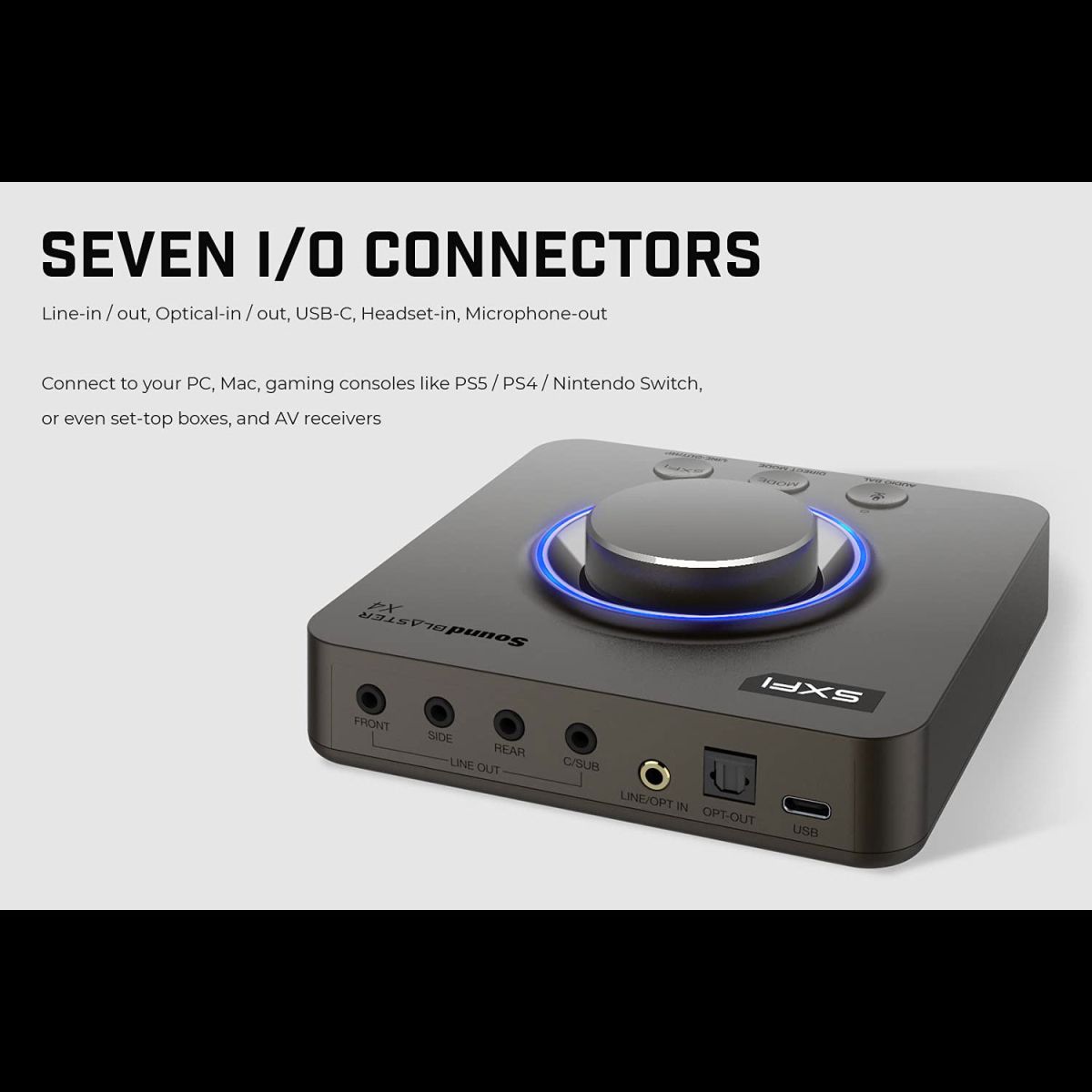 | Connectivity Options (Main) | 1 x ⅛″ Rear Out, 1 x ⅛″ Center / Sub Out, 1 x 1/8″ Headphone / Headset Jack, 1 x 1/8″ Ext. Mic-in Jack, 1 x TOSLINK Optical Out, 1 x ⅛″ Front-out, 1 x ⅛″ Optical / Line-in Combo Jack, 1 x ⅛″ Side Out Jack, 1 x USB-C port for PC / Mac |