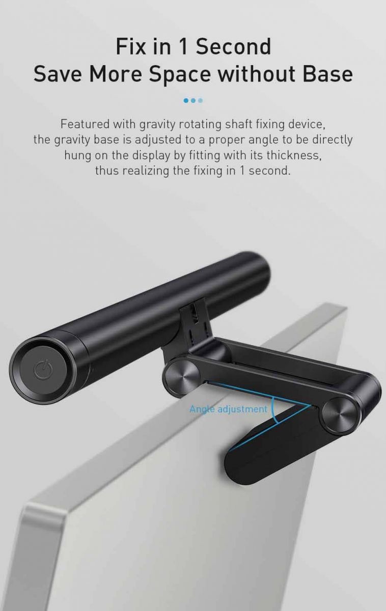 Đèn màn hình Baseus I-Work Pro Series sử dụng trục xoay trọng lực, giúp dễ dàng gắn vào màn hình của bạn. Thiết bị cố định này điều chỉnh đế trọng lực, cho phép bạn treo trực tiếp lên màn hình mà không chiếm bất kỳ không gian nào trên bàn. Đèn màn hình này sẽ chỉ mất một giây để xử lý.